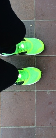 Here is a picture of my new green glow Nike Vomero 8+ shoes & legs. At first I felt some twinges then once I warmed up during my 500m test run it felt better. However, today my left calf is a bit tight, maybe it was compensating? NB This post is not about my legs!