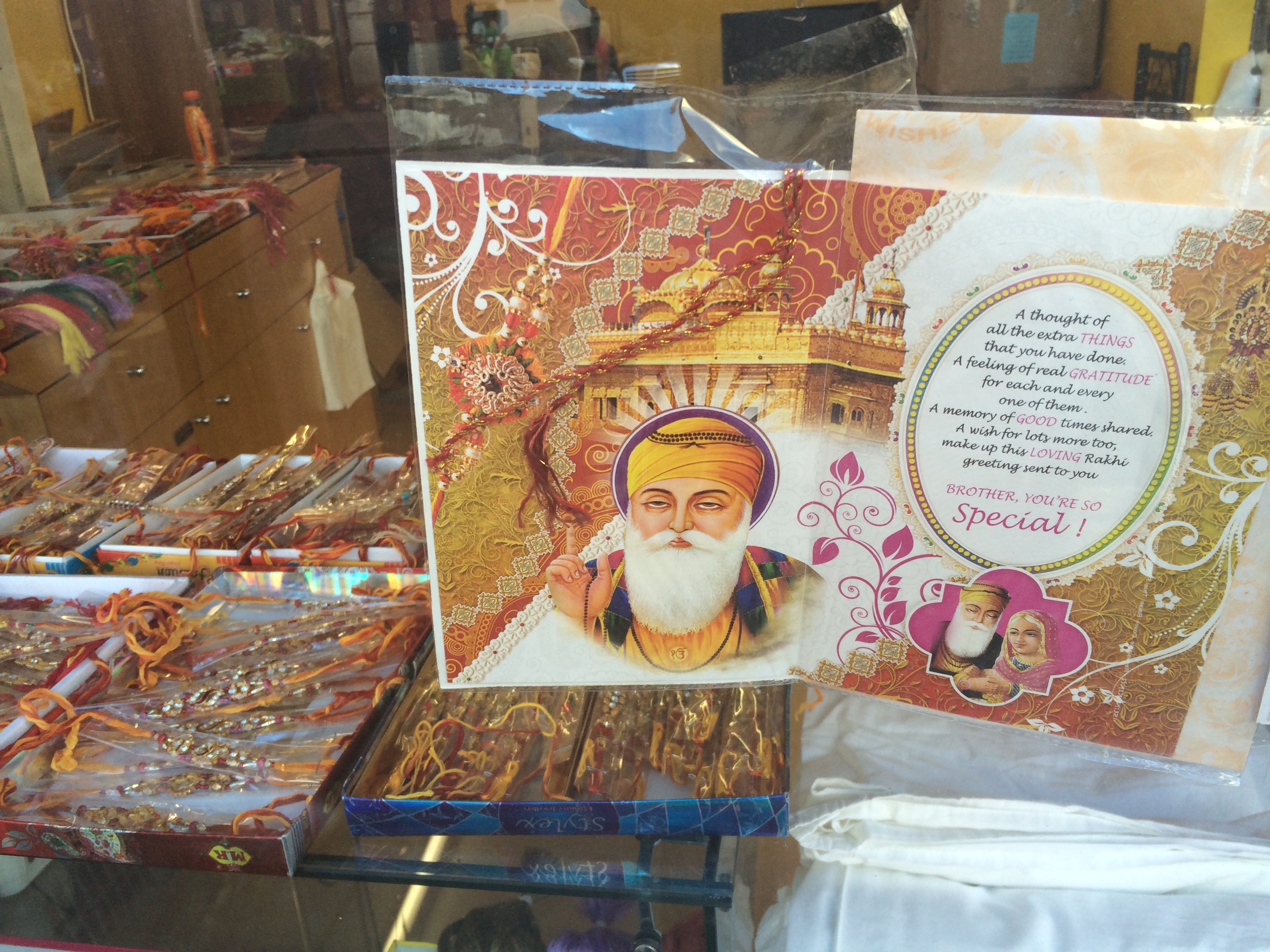 During a recent trip to Southall in the UK I was amazed to see the number of Rakhri’s on display. I managed to take a couple of pictures. One from a shop window display and the other after asking permission from the shop owner from an array of decorative threads on sale inside her shop. The images suggest a religious context..?